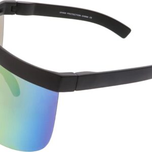 DetailsCreate an out of this world look with these futuristic visor sunglasses. Featuring an oversize frame with a flat top design and a matte finish, these shield sunglasses are finished with a colored mirror mono lens for a unique look. Perfect for parties or music festivals, these novelty sunglasses are sure to make a statement. Made with a plastic based frame, double barrel hinges, and a 100% UV protected lens.